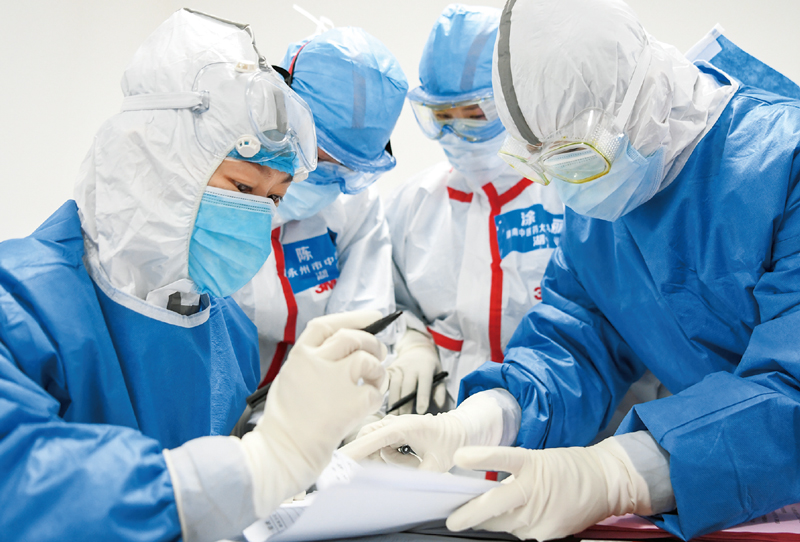2020年2月14日,武汉市首个以中医为主的方舱医院开始收治病人。这是医护人员在核对病人的床位安置信息。在新冠肺炎疫情防控和医疗救治中,我国发挥中医药优势,坚持中西医结合、中西医并重,取得了较好成效。 新华社记者 程敏/摄