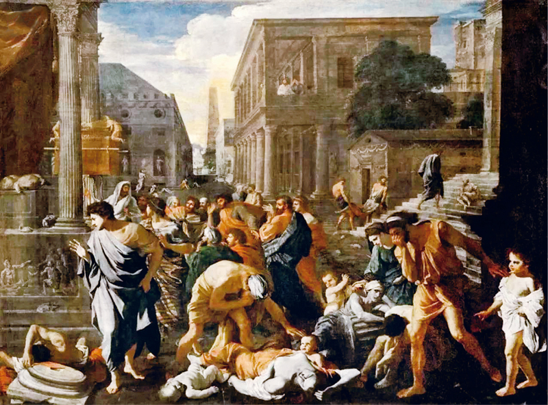 从公元165年开始,罗马帝国发生疫病。据历史记载,瘟疫一天造成多达2000罗马人死亡,并蔓延至莱茵河,甚至感染了帝国边界之外的日耳曼人和高卢人。17世纪法国画家尼古拉斯·普桑的名作《阿什杜德的瘟疫》,生动描绘了瘟疫流行时罗马帝国城市腐尸遍地、路人掩面的惨状。(资料图片)